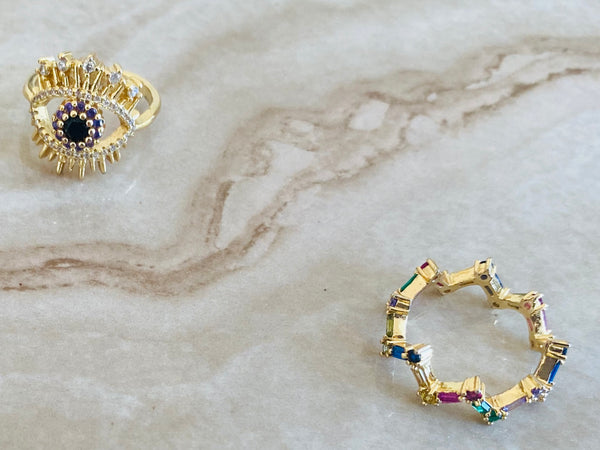 This 2 piece ring set gives your outfit a pop! The set consists of a purple Turkish eye and a rainbow stack wave ring. Accent your hands with the beautiful trendy gorgeous Cairo rings. Your hands will thank you. Each sold separately.